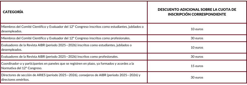 Todas aquellas personas que estén realizando algún tipo de colaboración para el Congreso, la revista AIBR y la revista ARIES tienen derecho a descuentos especiales, que son aplicables sobre cualquier modalidad de inscripción seleccionada